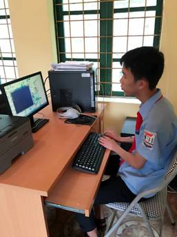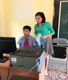 Cô giáo Bùi Minh Huệ - GV dạy Tin học – Hướng dẫn em Vi Văn Quân thực hành