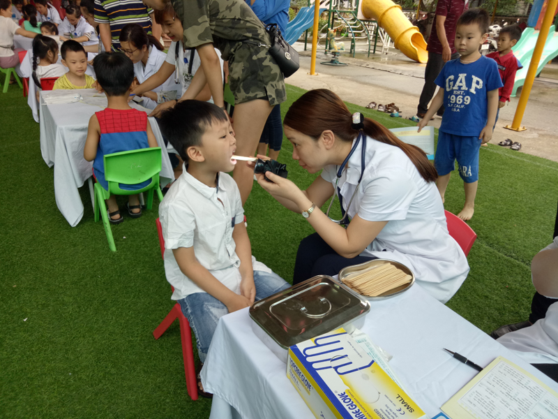 Với mục tiêu: Thăm khám sức khỏe cho trẻ trong nhà trường, tổng kết phân loại sức khỏe và bệnh tật của trẻ, phát hiện những bệnh của trẻ gây ảnh hưởng đến sức khỏe và công việc học tập, để sớm can thiệp y tế giúp trẻ có sức khỏe tiếp tục học tốt hơn. Tư vấn giáo dục sức khỏe cho phụ huynh và giáo viên biết được những bệnh thường gặp ở trẻ mầm non như bệnh tay chân miệng, sởi, bệnh đỏ mắt…Trong ngày thăm khám đã kịp thời phát hiện một số bệnh về răng miệng; tật khúc xạ, bệnh ngoài da, tai mũi họng, hô hấp, suy dinh dưỡng… Nhà trường đã ghi chép cẩn thận vào sổ theo dõi sức khỏe của trẻ và thông báo tới phụ huynh để cùng phối hợp chăm sóc tốt sức khỏe cho con em mình.