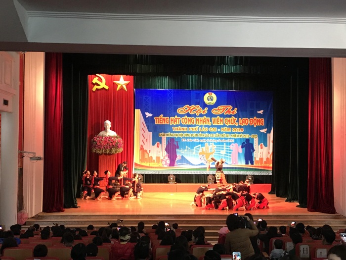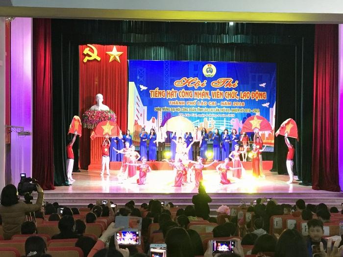 Thực hiện theo kế hoạch số 05 / KH –LĐLĐ ngày 14/3 /2018 của Ban thường vụ Liên đoàn Lao động thành phố Lào Cai về việc tổ chức hội thi tiếng hát công nhân, viên chức, lao động thành phố Lào Cai năm 2018. Sáng ngày 8/4/2018 tại Hội trường trung tâm thành phố Lào Cai diễn ra Hội thi tiếng hát CNVCLĐ, tham gia hội thi có 6 đoàn trong địa bàn thành phố Lào Cai với gần 100 diễn viên không chuyên, với 30 tiết mục đã được các diễn viên là CNVCLĐ trình diễn một cách đặc sắc hấp dẫn, đa dạng về cả nội dung lẫn hình thức thể hiện. Đoàn khối các trường tiểu học tham gia với 31 diễn viên đến từ 20 trường tiểu học trong thành phố với các tiết mục sáng tạo, phong phú, hấp dẫn đặc biệt các diễn viên thi nhiệt tình hăng say được ban giám khảo đánh giá rất cao tiêu biểu như các tiết mục hợp xướng nam nữ “Bài ca Hồ Chí Minh”, tiết mục múa “Bình minh trên rẻo cao” hay tam ca nữ “Bài ca cô giáo trẻ” giọng hát tốt phong cách biểu diễn hay. Kết thúc hội thi Ban tổ chức đã trao 02 giải A, 02 giải B, 01 giải C, 02 giải chuyên đề cho tiết mục hay nhất “Bài ca Hồ Chí Minh”, Công ty TNHHHT trao giải tiết mục múa “Bình minh trên rẻo cao” có hình tượng hay nhất và giải Nhì cho toàn đoàn khối tiểu học .