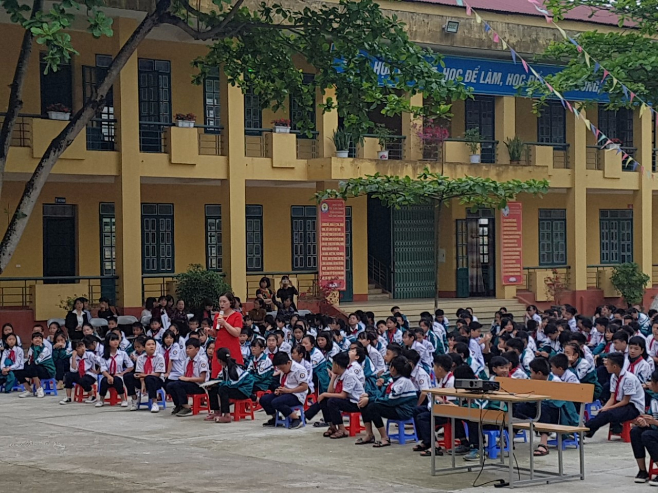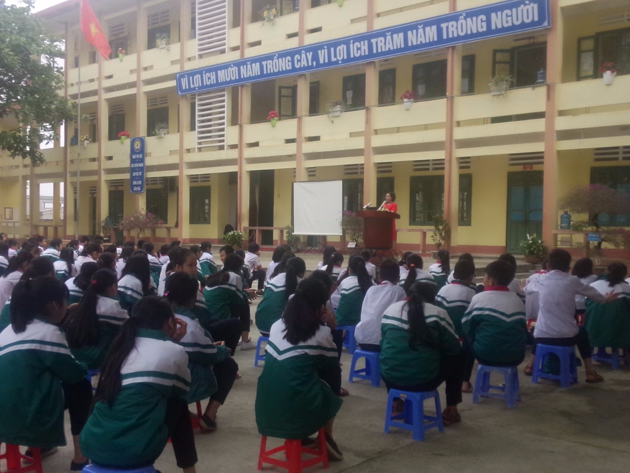 Sau khi lớp trực tuần đánh giá kết quả hoạt động của toàn trường trong tuần qua, Ban giám hiệu nhận xét triển khai kế hoạch tuần học mới, học sinh lớp 7B đã thể hiện một tiểu phẩm tự biên phản ánh các tệ nạn xã hội đang diễn ra hiện nay với thông điệp nhà trường, gia đình, xã hội cùng chung tay tạo môi trường giáo dục an toàn, lành mạnh và thân thiện.