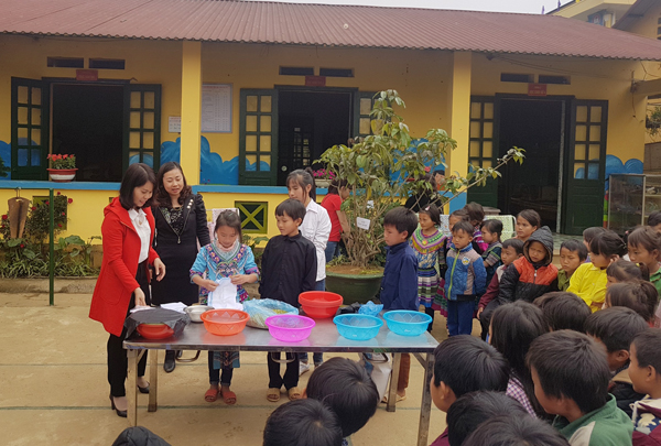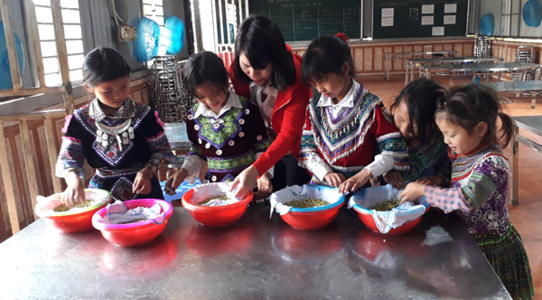Hướng dẫn học sinh kỹ thuật ngâm ủ giá đỗ. Đồng cảm với những khó khăn, thiếu thốn của thầy và trò Trường Tiểu học Hoàng Thu Phố 2, nhân dịp này, giáo viên và phụ huynh Trường Tiểu học Lê Văn Tám đã trao tiền mặt cùng 1 chiếc ti vi và hàng chục loại thực phẩm, tổng trị giá 23 triệu đồng phục vụ cho hoạt động bán trú của trường.