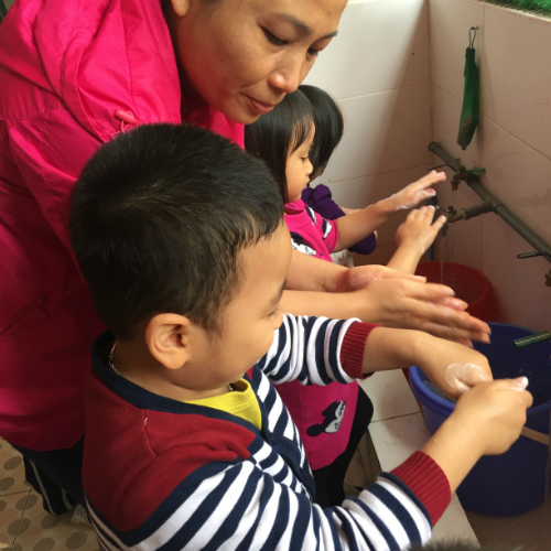 Cô hướng dẫn trẻ rửa tay dưới vòi nước chảy