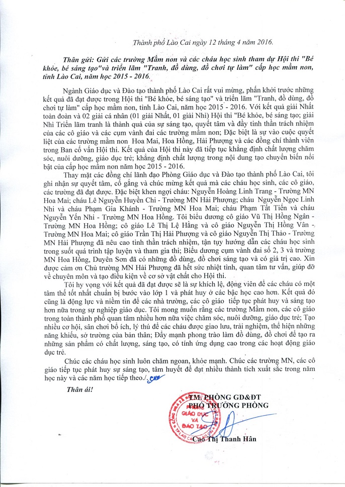 Thư đồng chí Cao Thị Thanh Hân phó trưởng phòng GD&ĐT TP. Lào Cai gửi các trường Mầm non thuộc TP. Lào Cai