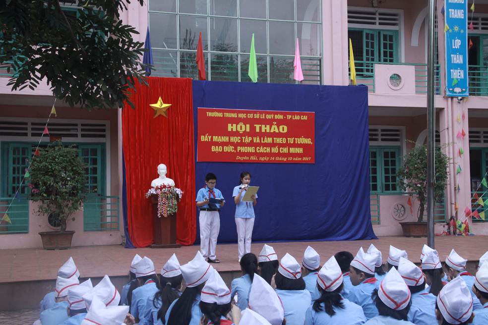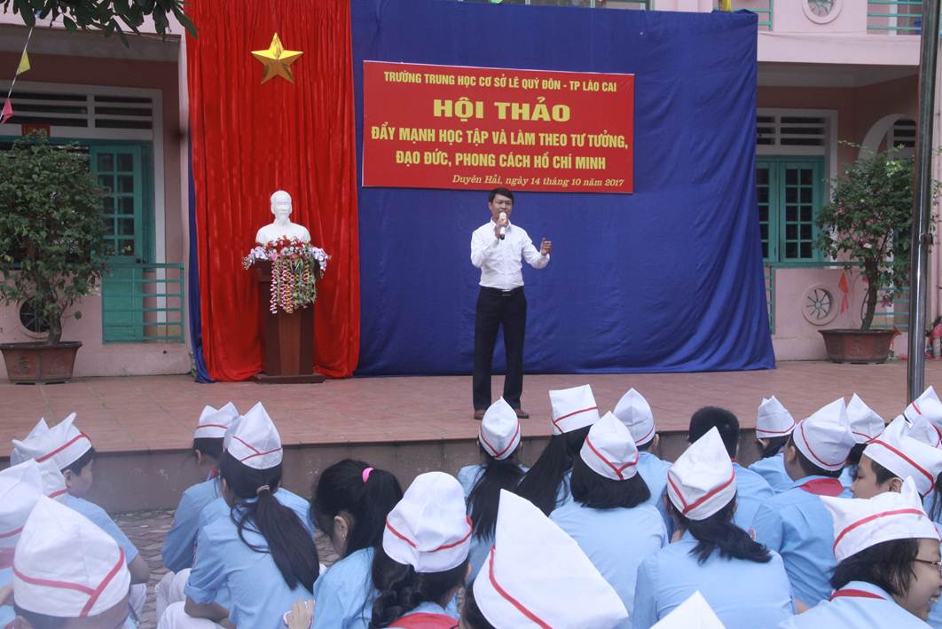 Tại hội thảo đã có 5 ý kiến tham luận của cán bộ quản lý trường học. Trường THCS Lê Quý Đôn tham luận về nội dung học tập phong cách tư duy, tự chủ và sáng tạo, phong cách làm việc khoa học của Bác trong công tác chỉ đạo và thực hiện hoạt động giáo dục toàn diện của đơn vị trường học chất lượng cao. Kết quả là nhà trường luôn đứng đầu Thành phố về số lượng, chất lượng giải học sinh giỏi các cấp; về kì thi vào THPT chuyên hàng năm. Tiêu biểu là em Bùi Phương Anh – học sinh lớp 9A đã xuất sắc giành vị trí Thủ khoa trong kỳ thi tuyển sinh vào trường THPT chuyên Lào Cai năm học 2017 – 2018 với số điểm đáng nể phục: 46,85 điểm, với điểm 10 môn  Toán chuyên. Em được bầu là đại biểu dự điển hình tiên tiến của tỉnh Lào Cai hè 2017. Em Khổng Phương Linh lớp 7A là đội viên xuất sắc được dự trại hè thiếu nhi tại Nhật Bản. Trong cuộc thi “Tuổi trẻ học đường là theo lời Bác” cấp tỉnh, em Nguyễn Thị Lê Vi lớp 8B đã đoạt giải Nhất, em Nguyễn Nhật Linh lớp 9A đoạt giải Nhì…