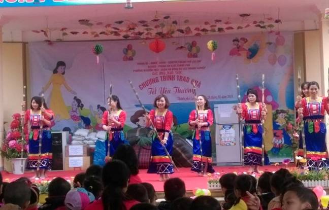 Mở đầu buổi trao quà là một số tiết mục văn nghệ của các cháu học sinh, các cô giáo của hai trường để chào mừng các vị khách quý đã không quản thời tiết lạnh giá mang những món quà đầy tình nghĩa đến với các cháu. Tiếp theo là phần trao quà được diễn ra hết sức trang trọng và thắm đượm tình người. Đ/C Minh – trưởng đoàn từ thiện đến từ phường Nguyễn Trãi quận Hà Đông, thay mặt Ban tổ chức chương trình “Tết yêu thương” phát biểu ý kiến, nêu rõ mục đích, ý nghĩa và tình cảm của các bác, các cô, các chú đối với các cháu học sinh hai trường mầm non Hợp Thành, Tả Phời có hoàn cảnh khó khăn. Cô gửi tặng chương trình bài hát “Thầy cô cho em mùa xuân”cô còn tâm sự, đoàn không chỉ trao cho các bé những món quà ấm áp tình thương; mà lớn hơn cả, đó là trao cho các bé sự cảm thông, sẻ chia ấm áp tình người. Hy vọng việc làm hôm nay sẽ đi vào ký ức tuổi thơ của các bé về nghĩa cử cao đẹp, về đạo lý “Thương người như thể thương thân” của cha ông ta từ bao đời nay. Đây là hành trang giúp các bé bước vào đời, cổ vũ các bé hãy cố gắng học tập, rèn luyện trở thành bé khỏe, bé ngoan, và sau này trở thành những công dân tốt, sống có tâm, có đức, có tài, góp phần xây dựng quê hương, đất nước, xây dựng xóm làng thân yêu, xứng đáng với sự quan tâm của các thầy cô, gia định nhà trường và xã hội.