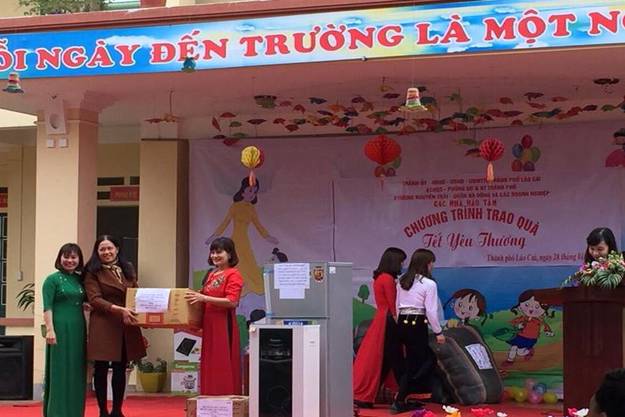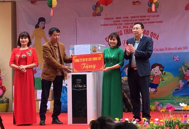 Sau ý kiến phát biểu của cô Nguyễn Thị Vân Khánh là phần trao quà - nội dung chính của chương trình. Dưới sự điều hành của cô Hoàng Thị Hải Anh, Chuyên viên PGD&ĐT thành phố Lào Cai, đại diện ban giám hiệu hai nhà trường lên trực tiếp nhận những món quà từ tay các bác, các cô, các chú doanh nghiệp xây dựng CĐT, các nhà hảo tâm đến từ phường Nguyễn Trãi quận Hà Đông, Phường Lê Trân thành phố Hải Phòng, nhà hàng Thuỷ Mừng Lào Cai ai cũng cảm thấy trong lòng xốn xang niềm vui. Dường như tết này đối với các bé hai trường Mầm non Hợp Thành, Tả Phời đón tết đầy đủ, ấm áp hơn và ý nghĩa hơn.