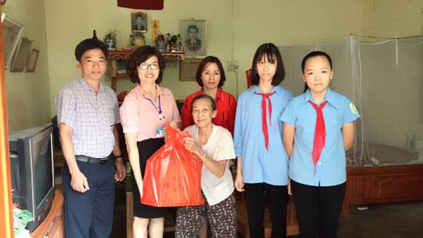 Các em học sinh trong Liên đội thăm hỏi và tặng quà cho gia đình bà Nông Thị Sim – gia đình có công với cách mạng, tại tổ 22- phường Cốc Lếu, TP Lào Cai.