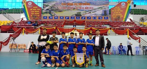 Hình ảnh 2: Nguyễn Mạnh Cường (hàng đầu tiên thứ 2 từ trái qua phải) cùng đội bóng đá và 2 thầy giáo của trường THCS Hoàng Hoa Thám nhận thưởng ở nhà thi đấu TDTT Tỉnh Phường Nam Cường, TP Lào Cai