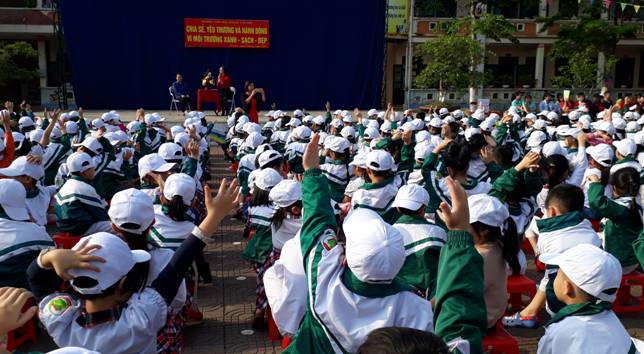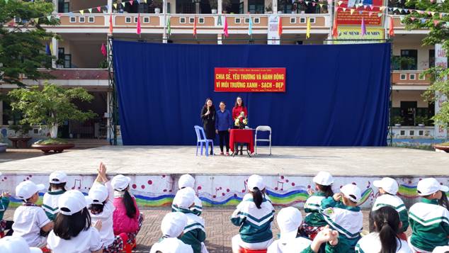 ( Học sinh cùng nhau chia sẻ với bác lao công về việc vệ sinh trường lớp) Chương trình “Chia sẻ- yêu thương- vì môi trường xanh sạch đẹp” lần đầu tiên được nhà trường tổ chức mà nội dung xoay quanh câu chuyện về những việc làm thầm lặng của bác Lao công. Khi những chia sẻ về công việc đầy vất vả của bác lao công được nói lên, hơn 1000 học sinh lắng nghe trong nghẹn ngào. Sự cảm thông, chia sẻ được nhân lên bằng tình yêu thương dành cho bác. Để rồi kết thúc chương trình những gương mặt xúc động nghẹn ngào ấy bừng sáng thể hiện quyết tâm chung tay chia sẻ những hành động thiết thực góp phần san sẻ những cực nhọc hàng ngày cùng bác lao công.