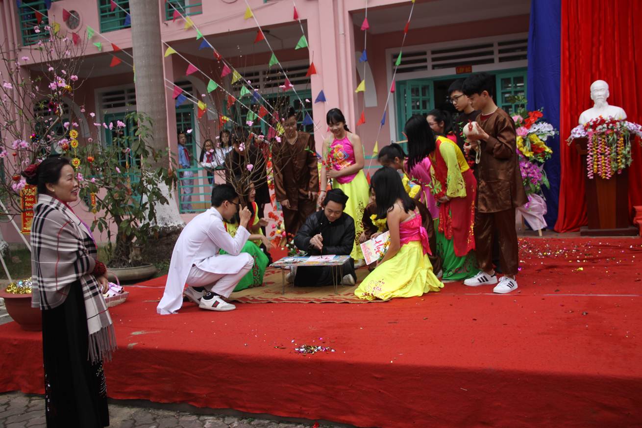 Mở đầu chương trình là phần Văn nghệ độc đáo với tiết mục Khách đến chơi nhà đặc sắc do các thầy cô giáo và phụ huynh thể hiện. Tiết mục đã làm sống dậy một không khí vui tươi, náo nức, một nét sinh hoạt truyền thống của ngày hội. Cũng trong chương trình văn nghệ chào xuân mới ấy, các em diễn lại hoạt cảnh ông đồ nhằm khơi dậy một nét văn hóa độc đáo của dân tộc Việt Nam ta đó là phong tục Viết câu đối ngày tết. Cũng qua hoạt cảnh đó tục “Xin chữ- Cho chữ” được tái hiện hết sức ấn tượng với phần cho chữ, tặng chức cho các độc giả. Các chữ Học, Trí, Tài, Nhân… ngẫu nhiên được tặng cho các quý vị đại biểu, các thầy cô và các em học sinh thật háo hức và ý nghĩa.