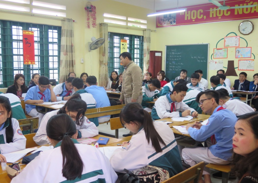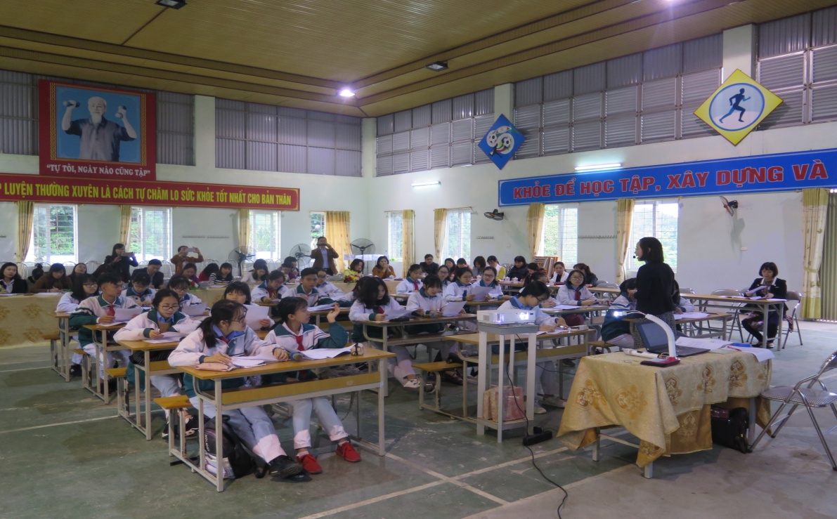 Ảnh: Giờ học Toán do thầy giáo Vũ Quốc Hùng, trường THCS Xuân Quang 1, huyện Bảo Thắng thực hiện. Bên cạnh đó, tại các phòng học đã diễn ra các cuộc hội thảo của tổ chức Công đoàn, Đội TNTP Hồ Chí Minh và Ban đại diện CMHS. HS tham gia hùng biện tiếng Anh theo chủ đề