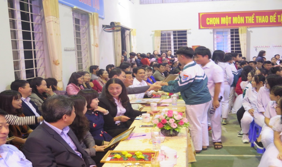Ảnh: Học sinh trường THCS Lê Hồng Phong tặng quà các vị đại biểu