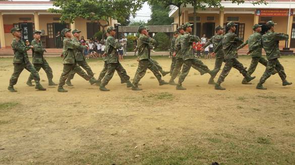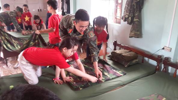Tinh thần cổ vũ hết mình của các chiến sĩ Tí hon –khối 2 Sau phần giao lưu văn nghệ là các hoạt động trải nghiệm “1 ngày làm chiến sĩ ”. Các em được chứng kiến các hoạt động của đơn vị diễn ra trong ngày sau đó được các chiến sĩ trực tiếp hướng dẫn lại như Đội hình đội ngũ, gấp chăn màn, các bài tập trên thao trường như : Phòng thủ, chặt xườn….
