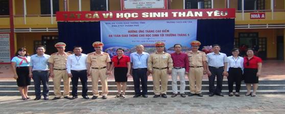 Đoàn công tác chụp ảnh lưu niệm với nhà trường Buổi tuyên truyền mang đến những nội dung bổ ích với thông điệp: Bạn và tôi hãy cùng nhau chấp hành tốt Luật giao thông để cuộc sống của chúng ta ngày thêm nhiều niềm vui, hạnh phúc . Tuổi trẻ trường THCS Kim Tân với tư cách là chủ nhân tương lai của đất nước, là thế hệ tiên phong trên nhiều lĩnh vực cần có những suy nghĩ đúng đắn và tự giác thực hiện Luật giao thông để giảm thiểu tai nạn, mang lại niềm vui và hạnh phúc cho bản thân, gia đình và toàn xã hội.