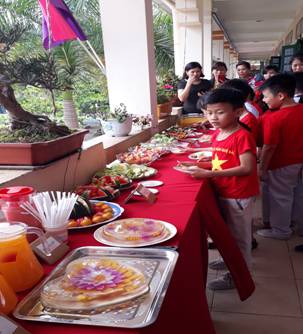 Kết thúc phần hội, các em học sinh lớp 3A3 và 13 em học sinh lớp 3 trường TH Thị trấn Bắc Hà thực hành tiết học: Kỹ năng ăn tiệc đứng (buffet). Các em rất thích thú xếp hàng lấy thức ăn và ăn rất lịch sự.