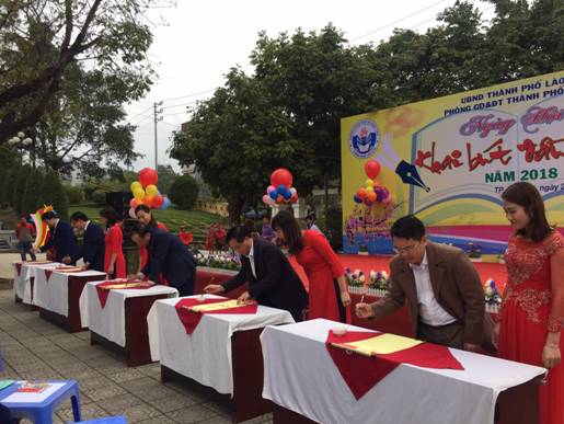 Đến dự và khai bút có các đồng chí Mai Đình Định, UVBTV tỉnh ủy Bí thư thành ủy, chủ tịch HĐND thành phố, đồng chí Nguyễn Anh Ninh Giám đốc Sở GD&ĐT tỉnh Lào Cai, đồng chí Lê Quang Minh Chủ tịch UBND thành phố, đồng chí Đoàn Văn Ngàn Phó chủ tịch UBND thành phố, cùng các đồng chí lãnh đạo, chuyên viên phòng GD&ĐT, 145 CBQL các trường mầm non phổ thông và đặc biệt là sự có mặt của 188 em học sinh đại diện cho gần 20.000 học sinh các trường TH và THCS tham gia. Tại ngày hội đã có rất nhiều các hoạt động thể hiện tinh thần và ý chí của ngành giáo dục trong buổi tái giảng sau tết, trước anh linh của chủ tịch Hồ Chí Minh vĩ đại, ngành giáo dục đã tổ chức dâng hương và báo công với Bác sau đó là phần khai bút của các đồng chí lãnh đạo với 5 chữ : Đức, Nhân, Trí, Lễ, Nghĩa nội dung này có ý nghĩa đặc biệt thể hiện sự linh thiêng trong thời khắc quan trọng, kế thừa truyền thống giáo dục đạo lý, uống nước nhớ nguồn, tôn sư trọng đạo của dân tộc. Đồng thời bày tỏ tấm lòng thành kính đối với ân đức của các bậc thánh nhân đã có nhiều cống hiến cho nền giáo dục. Phát biểu trong buổi khai mạc đồng chí trưởng phòng Giáo dục và Đào tạo đã nêu bật được những thành tích mà toàn ngành đã đạt được trong năm 2017 với những con số ấn tượng như: Về đích chỉ tiêu xây dựng trường chuẩn Quốc gia trước 3 năm so với Nghị quyết của đại hội Đảng bộ thành phố nhiệm kì 2015 -2020, số chất lượng học sinh đạt giải quốc gia qua các kì thi tăng cao 212 lượt giải tăng 149 lượt giải..mục tiêu đó tiếp tục được ngành giáo dục cụ thể hóa trong các nghị quyết chuyên đề duy trì bền vững với các giá trị hiện đại và hội nhập trong năm học 2017 -2018.
