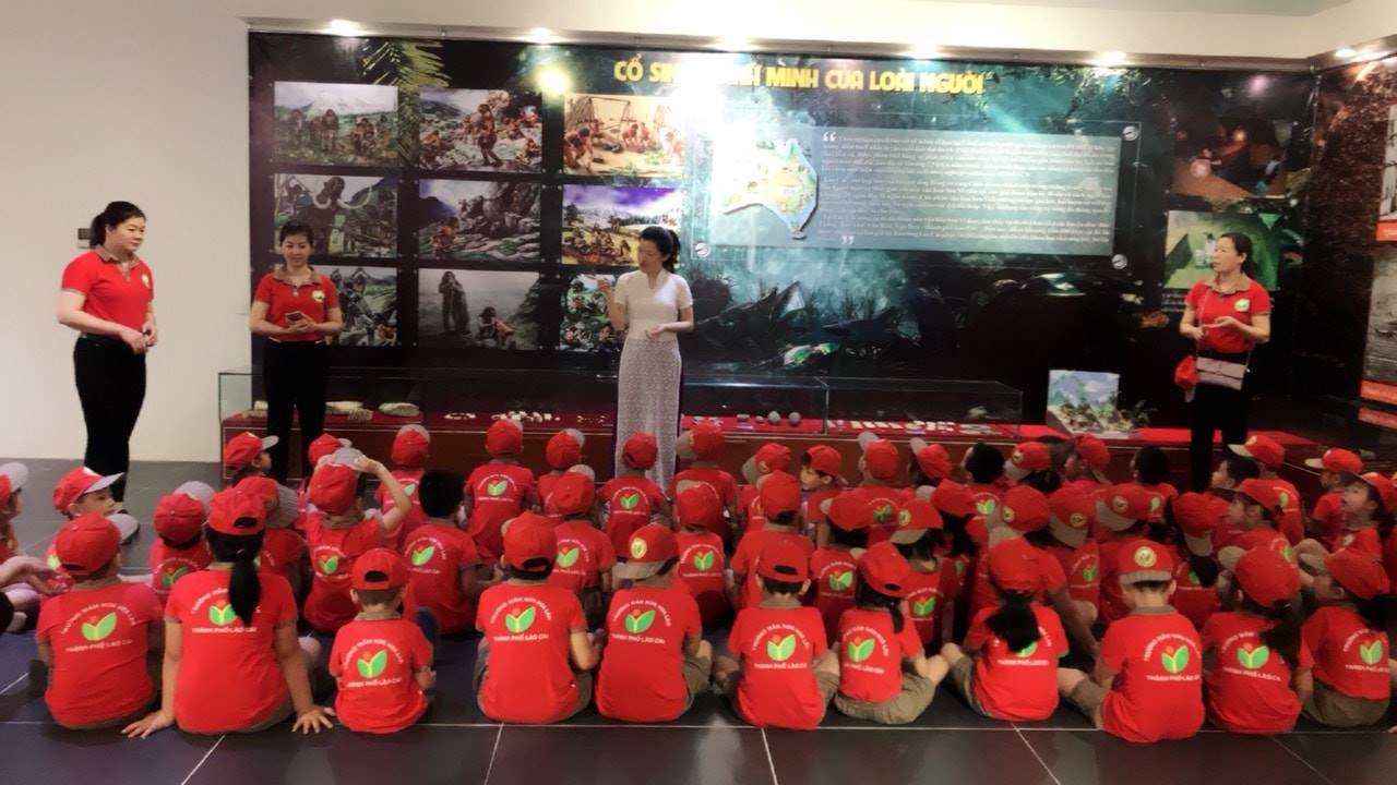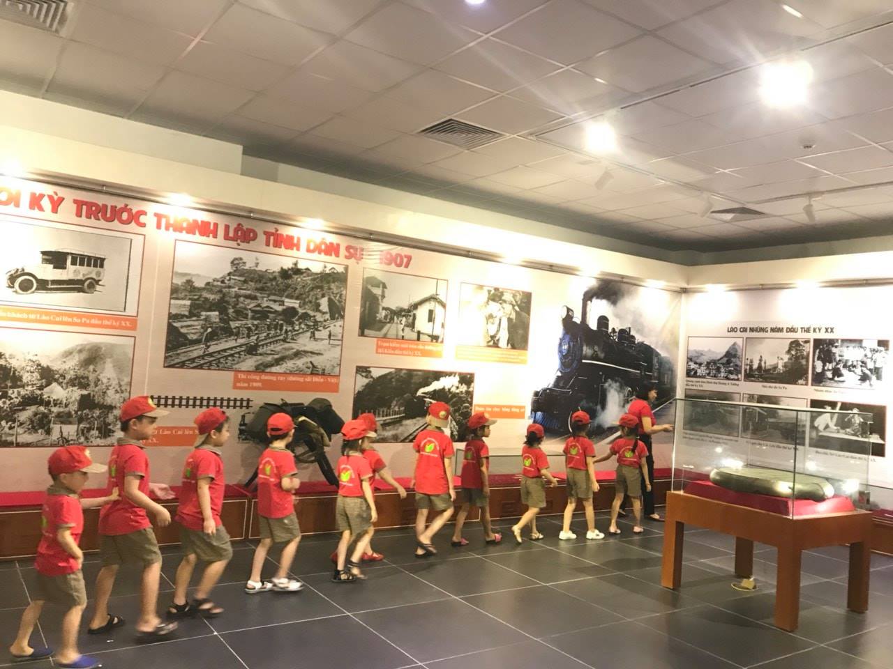 “Uống nước nhớ nguồn” đó là truyền thống tốt đẹp của dân tộc Việt Nam ta từ bao đời nay vẫn gìn giữ và phát triển. Nơi đầu tiên các bé đi thăm quan là khu Bảo Tàng tỉnh Lào Cai, nơi lưu giữ hình ảnh, hiện vật về đất nước, con người Việt Nam qua các thời kỳ lịch sử. Tại đây các bé được các cô hướng dẫn viên nhà Bảo Tàng thuyết minh tỉ mỉ giúp các bé hiểu và được trải nghiệm thực tế, nâng cao sự hiểu biết về môi trường văn hóa, lịch sử của tỉnh Lào Cai thêm yêu quí và tự hào về quê hương của các bé. Đi vào khu di tích các bé xếp hàng thật ngay ngắn nghiêm trang và lịch lãm theo sự chỉ dẫn của các cô hướng dẫn viên Bảo Tàng. Điều được các bé thích thú nhất đó là được nghe các cô thuyết minh, được chụp ảnh lưu niệm với các hiện vật quí của nhà Bảo Tàng.