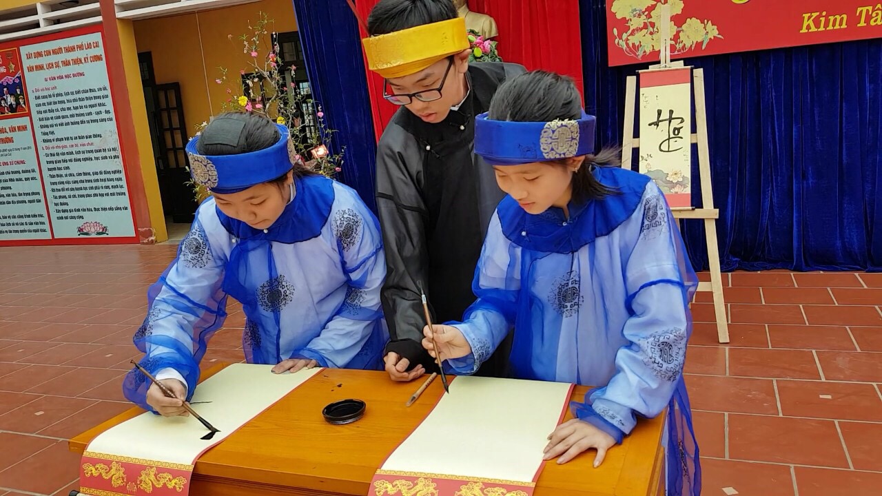 “Ngày thơ Việt Nam” mà các bạn học sinh đem đến cho chương trình, không thể không nhắc đến tiết mục “Dạy trò viết thư pháp” do 06 em học sinh thể hiện. Đây thực sự là tiết mục ấn tượng và giàu ý nghĩa nhất, với những trang phục áo the, khăn xếp cùng mực tàu, giấy đỏ các em đã tái hiện lại không khí của thú chơi Thư pháp xưa. Đó là nét văn hóa truyền thống trong lịch sử dân tộc.