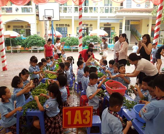 Phần thể hiện “Khéo tay hay làm” của các em được lồng ghép tích hợp với hoạt động giáo dục rèn kĩ năng sống, gắn với mô hình “Khởi nghiệp- Khơi nguồn yêu thương” Hoạt động này, các bậc cha mẹ học sinh chung tay góp sức cùng các thầy cô đã hướng dẫn các em tạo các sản phẩm phục vụ chính gia đình các em: hàng trăm túi giá đỗ, gần một nghìn túi rau sạch đã hoàn thành phục vụ cho tất cả các bạn học sinh trong trường và nhiều vị khách đặc biệt đến đặt hàng ủng hộ cho các bạn học sinh của trường. Các em học sinh hăng hái chuẩn bị, tham gia trực tiếp vào tất cả các khâu làm bánh: Chuẩn bị, nặn bánh, luộc bánh, vớt bánh, trưng bày, thưởng thức bánh và gói làm quà tặng người thân trong gia đình; làm hoa quả dầm: gọt, thái hoa quả; pha chế các loại chè; ngâm giá đỗ, nhặt giá đỗ; nhặt rau sạch đóng túi để phục vụ khách hàng.